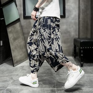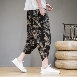 Men Summer Wide Leg Pants Man Casual Calf-length Pants New Printed Cotton Male Baggy Harem Pants Trousers Dropshipping