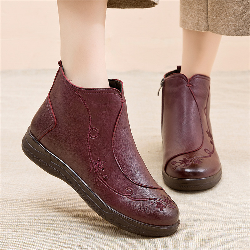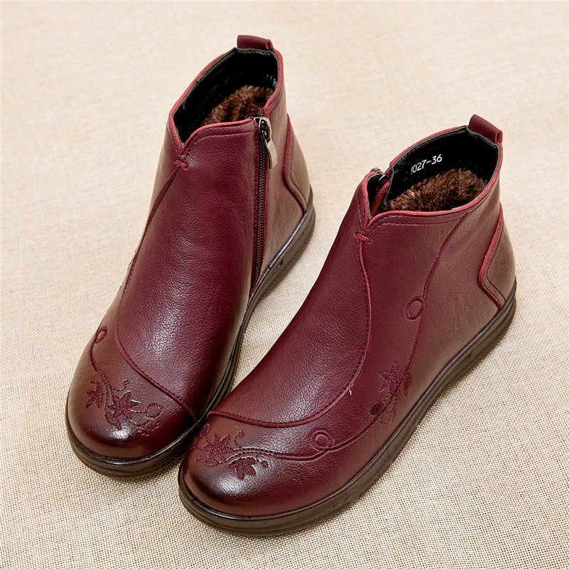 Winter leather mother cotton shoes soft bottom middle-aged female boots plus velvet warm flat-bottomed Non-slip ankle snow boots