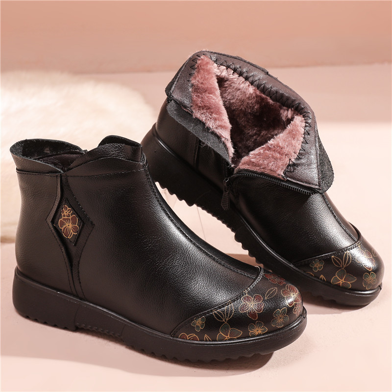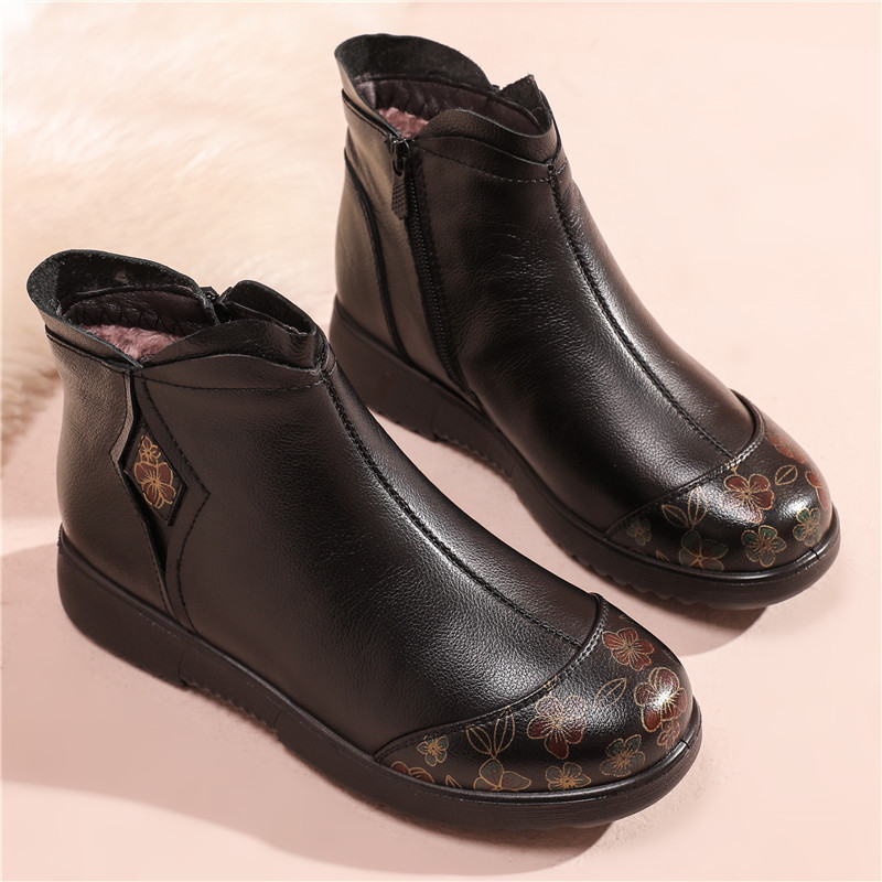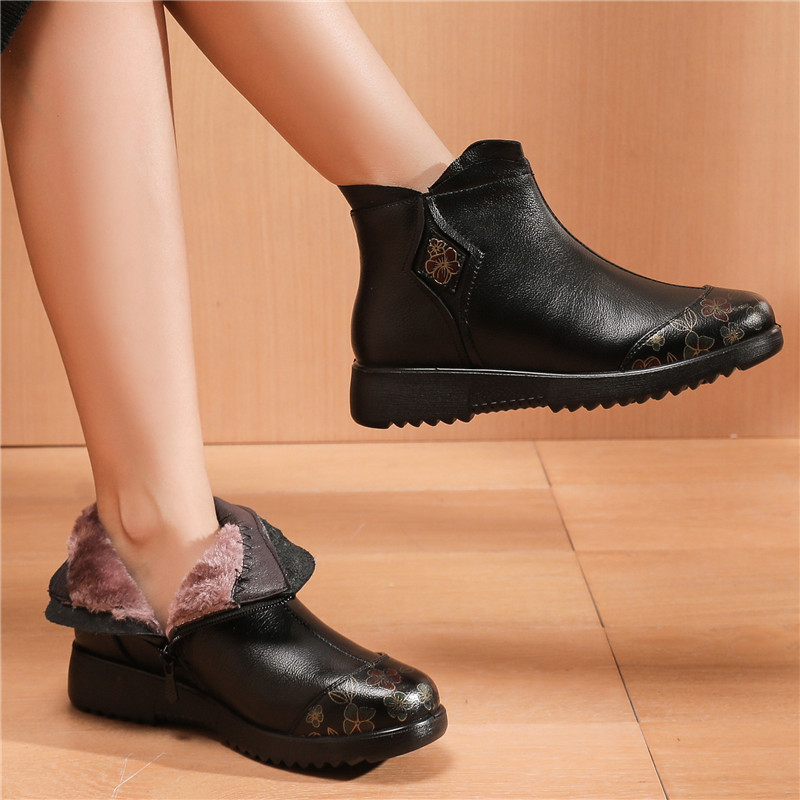 Women’s genuine leather boots flat heel soft sole middle-aged and elderly short boots plus velvet warm winter mother shoes