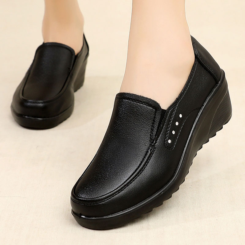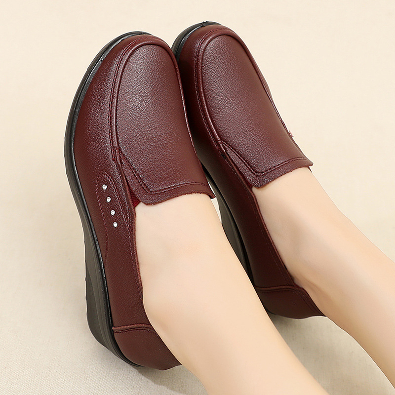 Spring And Autumn New Women’s Single Shoes Wedges Soft Sole Comfortable Large Size Mother’s Leather Mid-heel Pumps