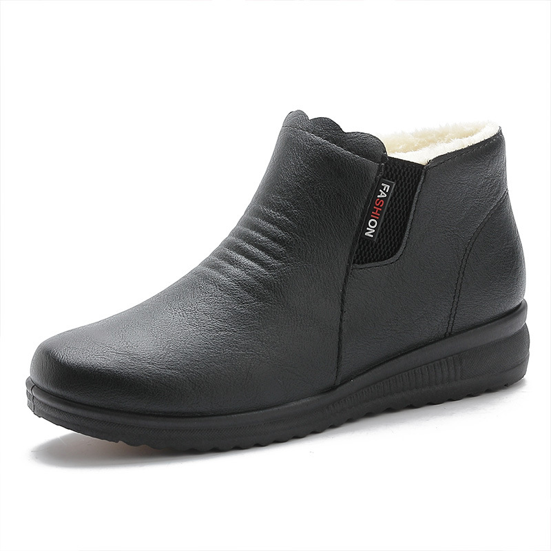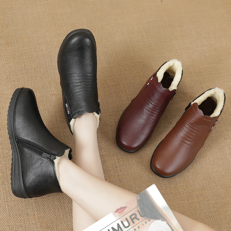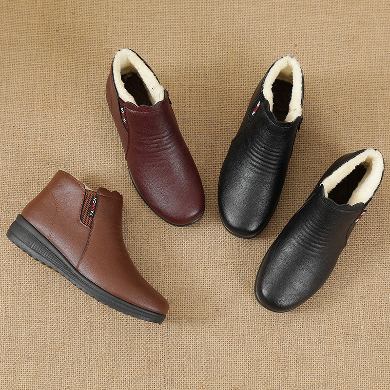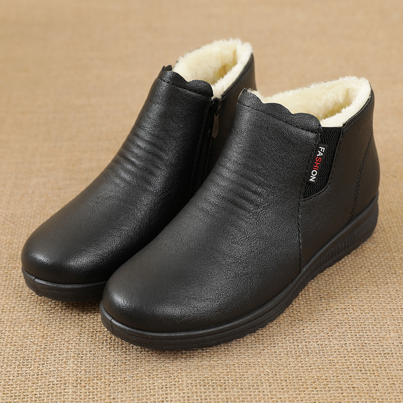 Winter mother’s cotton shoes plus velvet warm leather middle-aged ankle snow boots low-heel flat non-slip women’s shoes