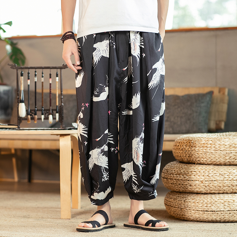Men Printed Chinese Style Summer Casual Pants Mens Cotton Wide Leg Loose Trousers Male Oversize Calf-Length Pants