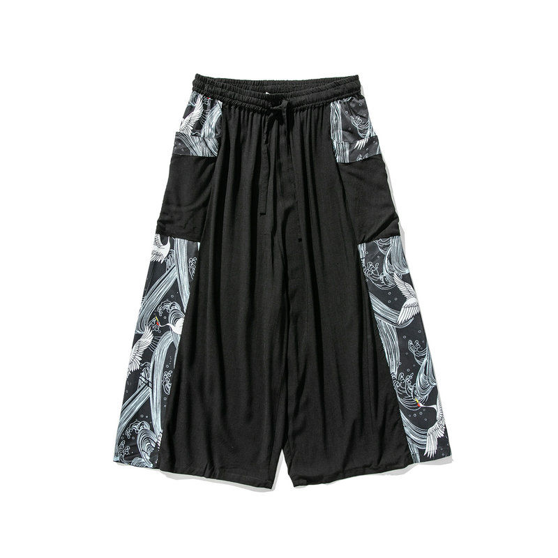 Men Printed Chinese Style Summer Casual Pants Mens Cotton Wide Leg Loose Trousers Male Oversize Calf-Length Pants