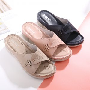Summer leather soft-soled beach women’s slippers lightweight and comfortable mid-heel wedges non-slip open-toe women’s sandals