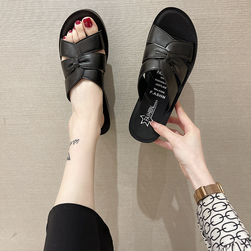 Summer leather soft-soled beach women’s slippers lightweight and comfortable mid-heel wedges non-slip open-toe women’s sandals