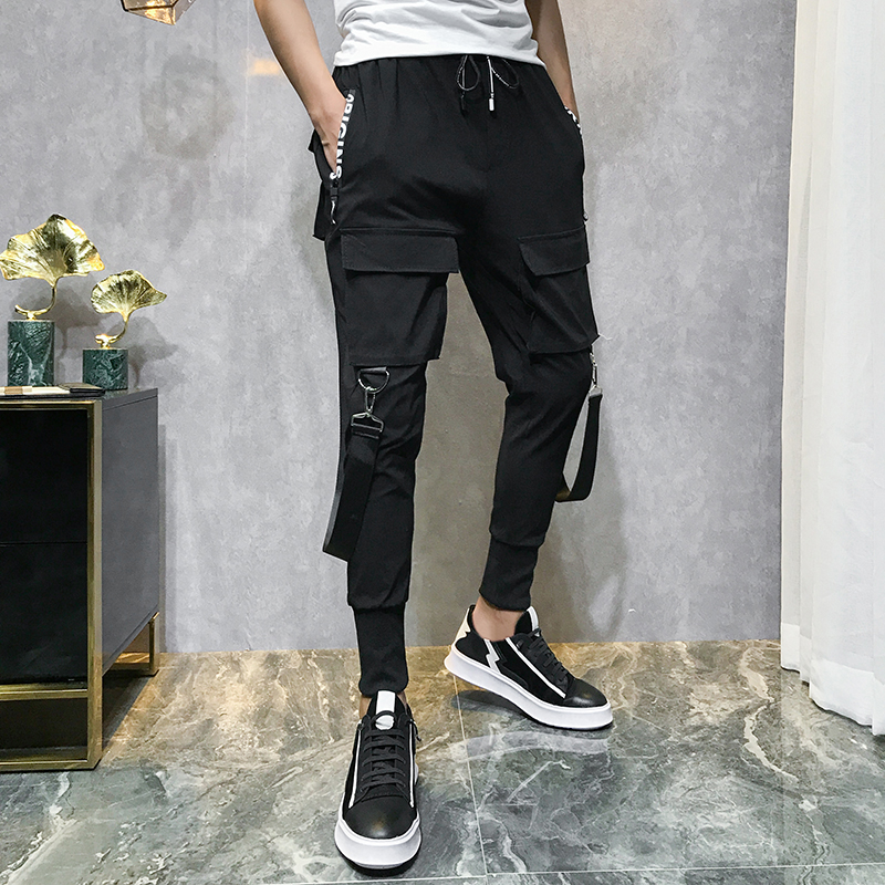 Men’s Fashion Pants Streetwear Overalls Black Harem Pants Ribbons Pockets Hip Hop Jogger Pants Casual Pants Trousers New