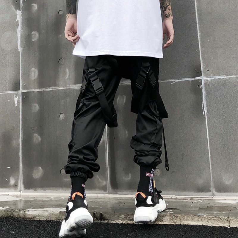 Pockets Hip Hop Cargo Pants Men Streetwear Fashion Harem Pants Harajuku Pants Joggers Ribbon Black Trousers Sweatpants