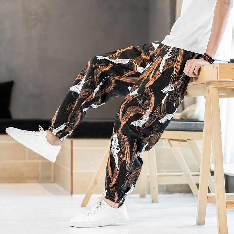Men Printed Chinese Style Summer Casual Pants Mens Cotton Wide Leg Loose Trousers Male Oversize Calf-Length Pants