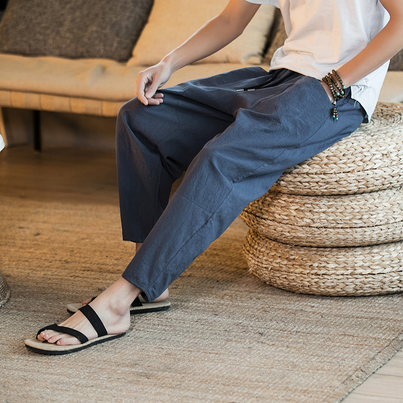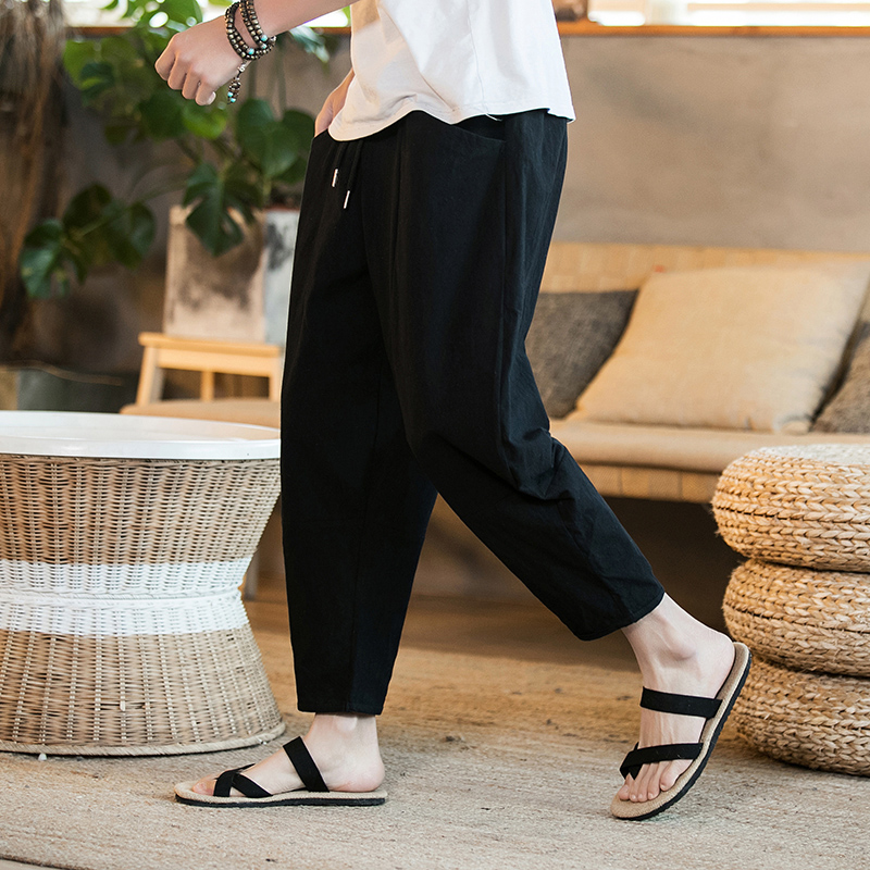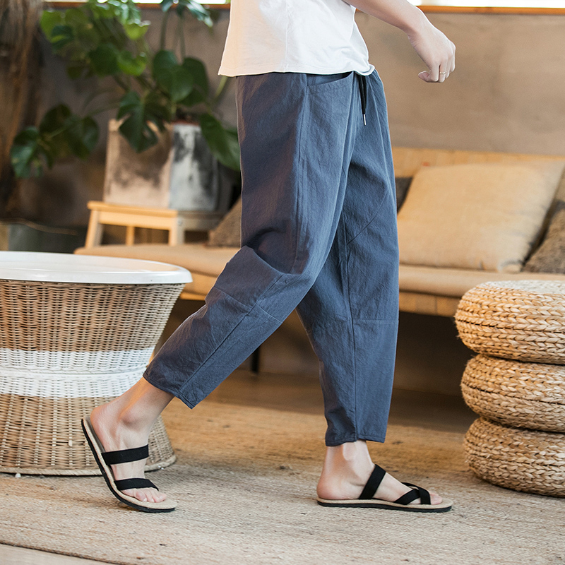 New Men Summer Cotton Linen Harem Pants Fashion Baggy Casual Loose Cropped Pants Drawstring Male Trousers Streetwear