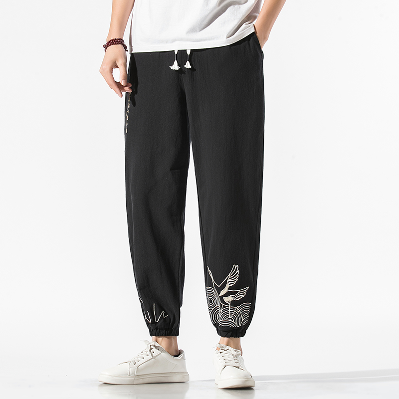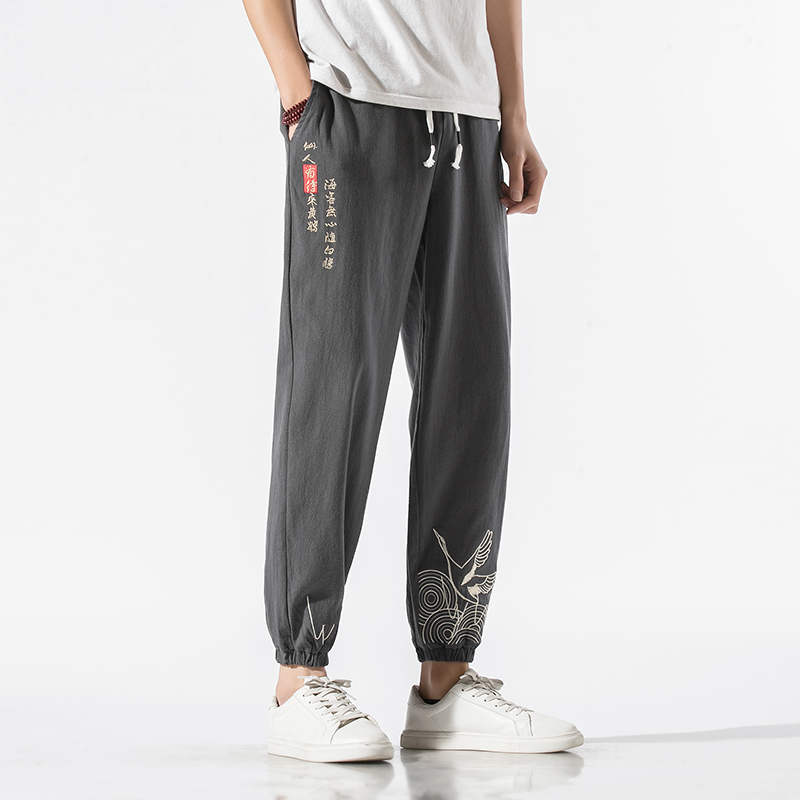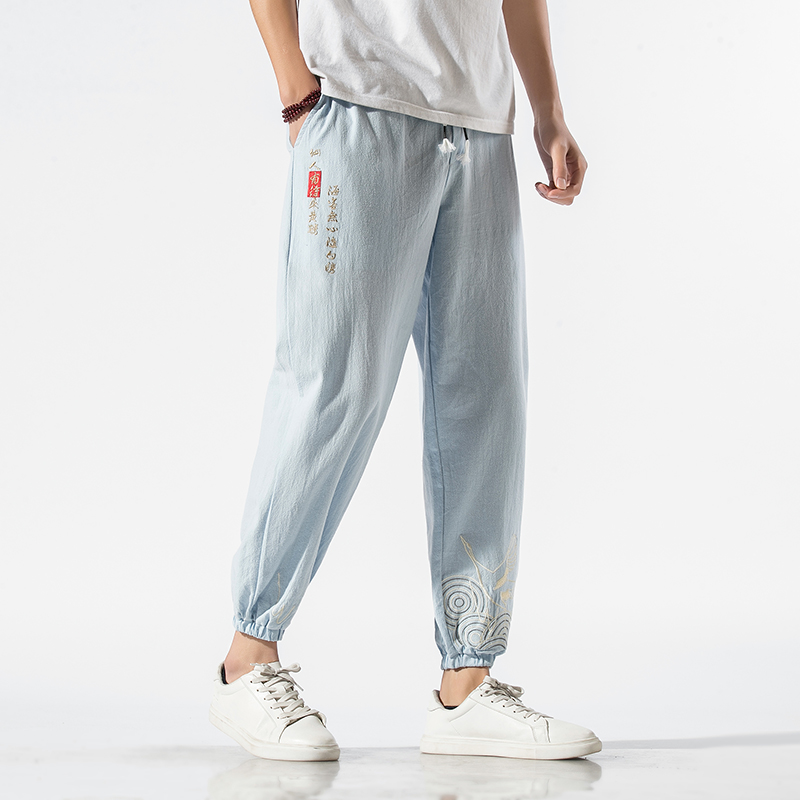 Men Printed Chinese Style Summer Casual Pants Mens Cotton Wide Leg Loose Trousers Male Oversize Calf-Length Pants