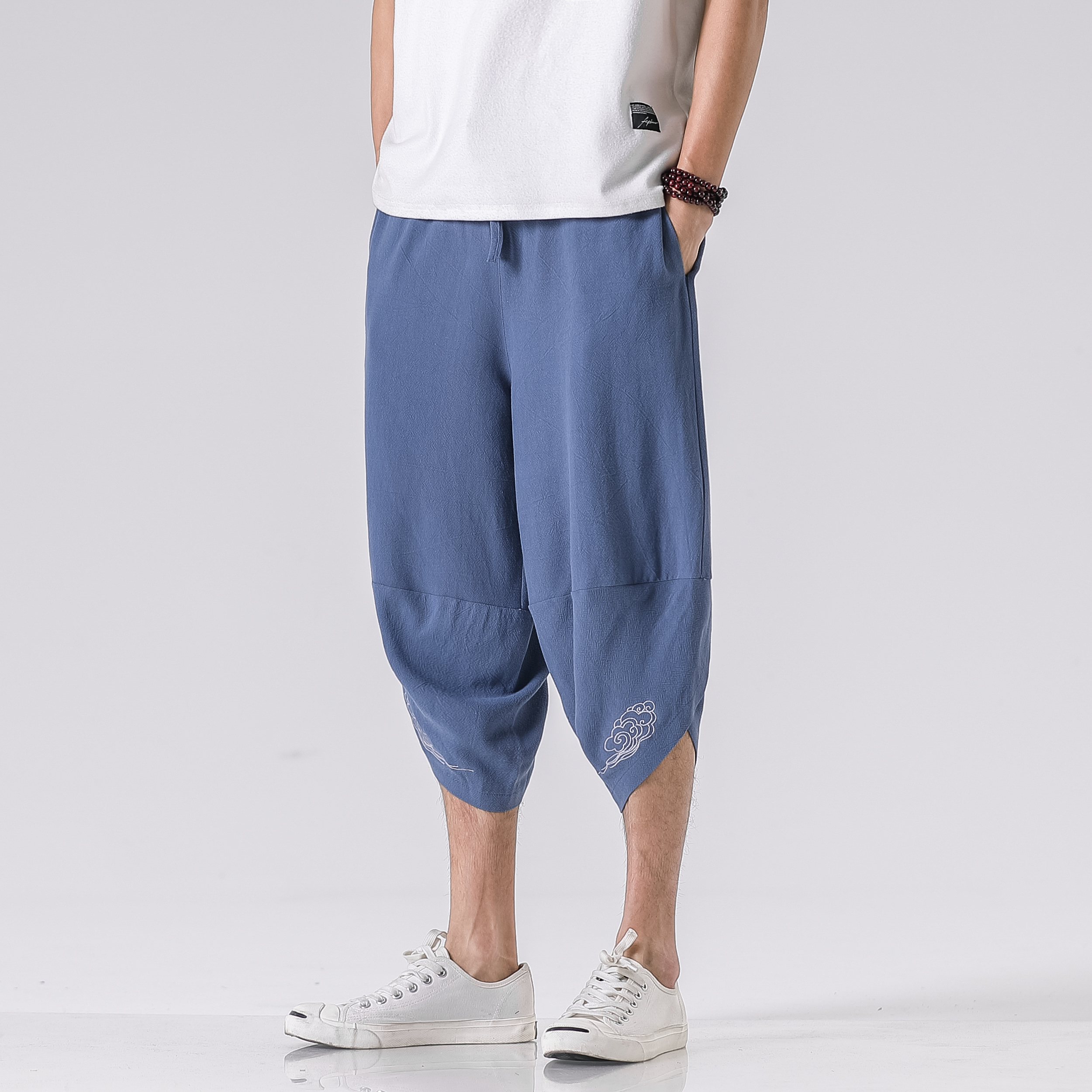 Cotton Mens Harem Pants Summer Male Casual Calf-Length Pants Printed Big Pocket Baggy Pants Trousers Men Streetwear
