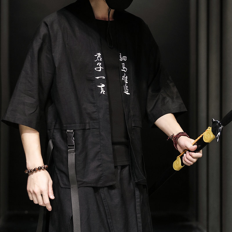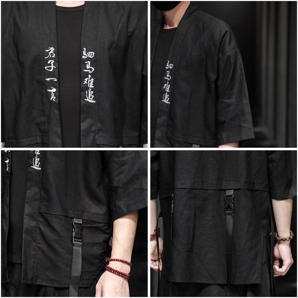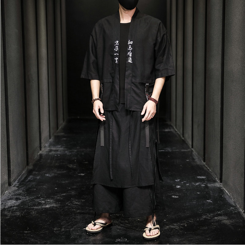 Casual Men Shirt Cotton Linen Men Set Sweatpants Male Streetwear 2 Piece Set Harajuku Style Big Size Pants+Shirt Black M-5XL