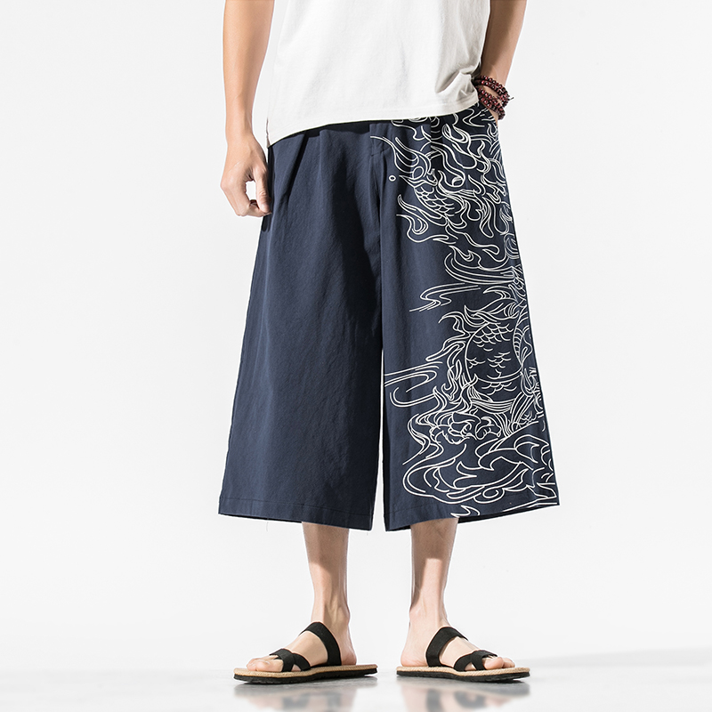 Men Printed Chinese Style Summer Casual Pants Mens Cotton Wide Leg Loose Trousers Male Oversize Calf-Length Pants