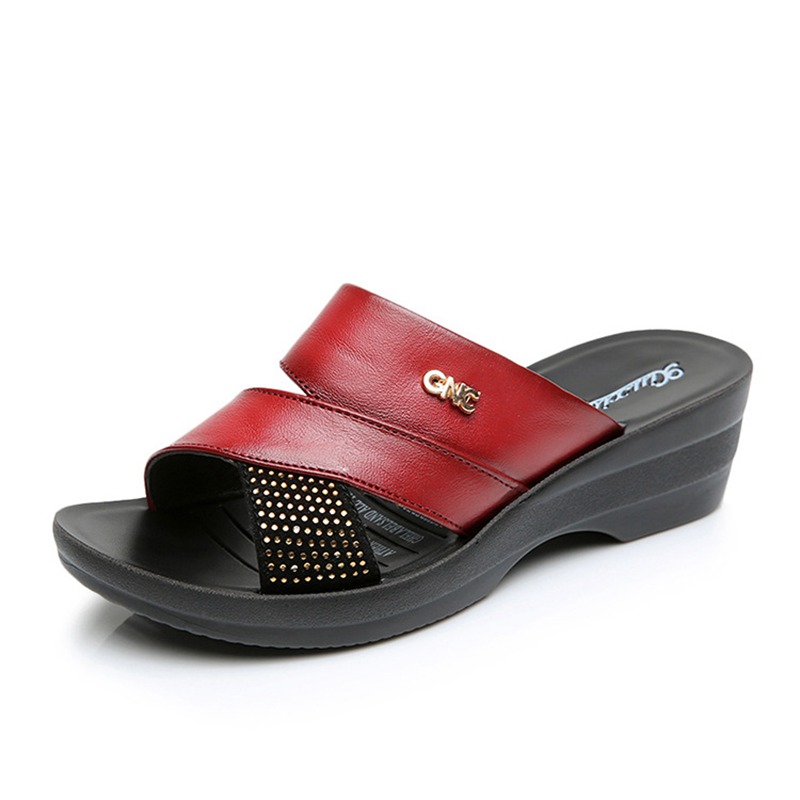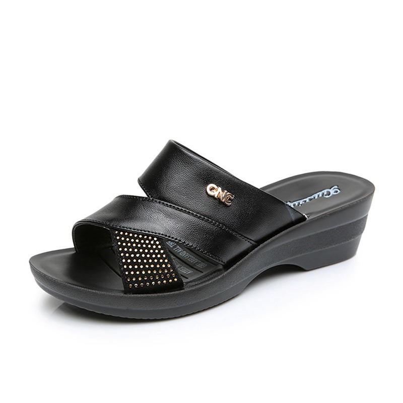 Summer leather soft bottom mother slippers wedges with outdoor wear sandals middle-aged and elderly non-slip casual slippers