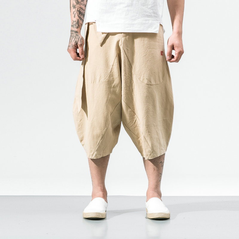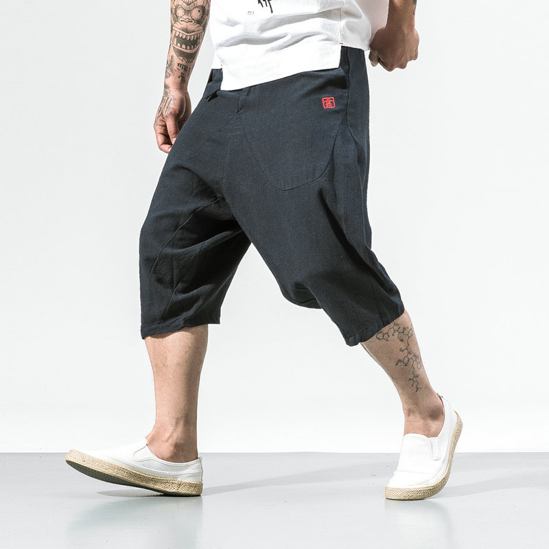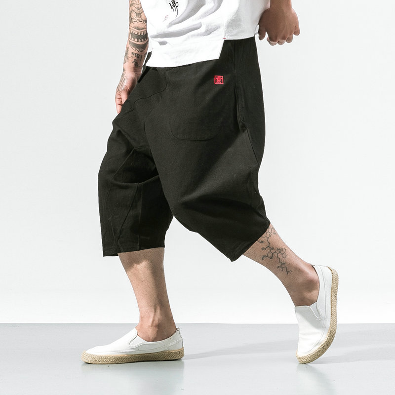 Men Printed Chinese Style Summer Casual Pants Mens Cotton Wide Leg Loose Trousers Male Oversize Calf-Length Pants