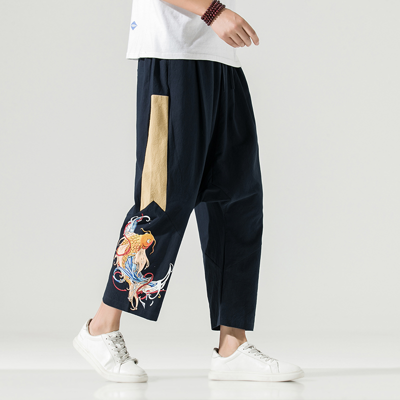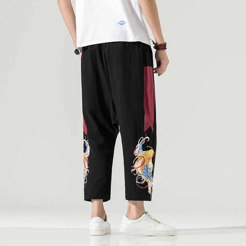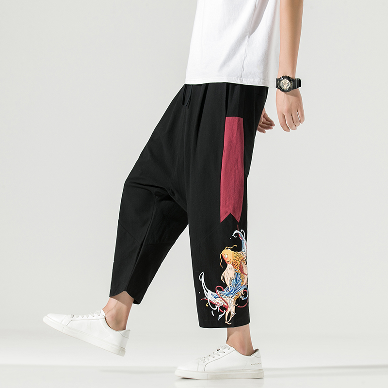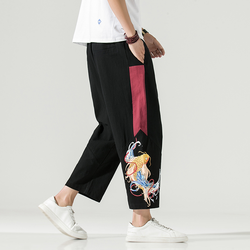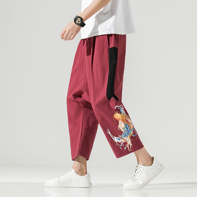 Men Printed Chinese Style Summer Casual Pants Mens Cotton Wide Leg Loose Trousers Male Oversize Calf-Length Pants