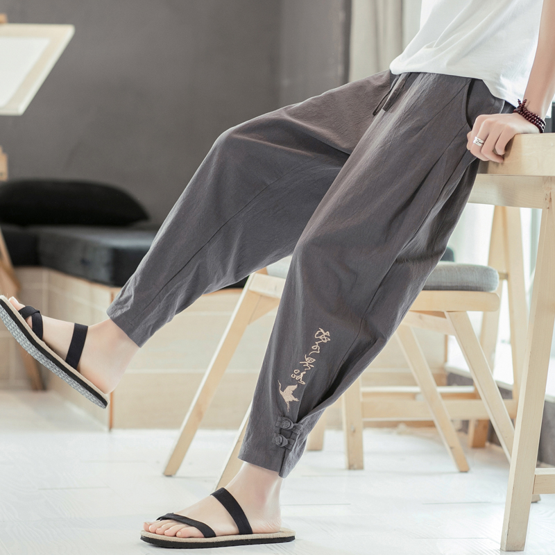 Fashion Men Embroidery Loose Harem Pants Mens Cotton Linen Big Size High Quality Trousers Male Ankle-Length Pants 5XL