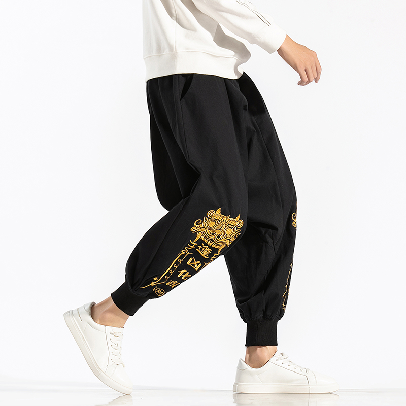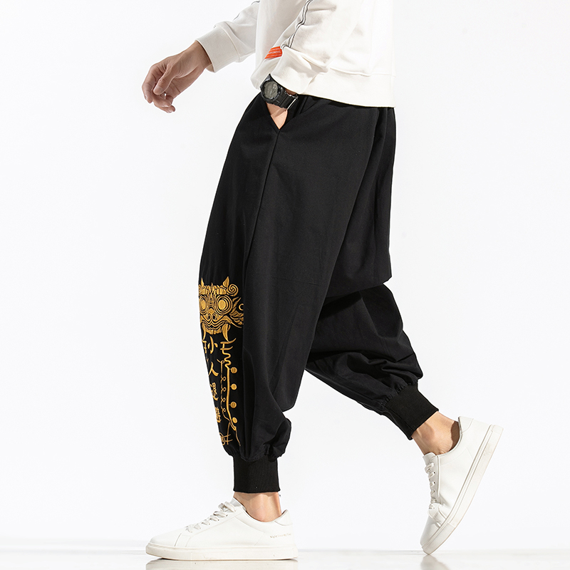 Men Printed Chinese Style Summer Casual Pants Mens Cotton Wide Leg Loose Trousers Male Oversize Calf-Length Pants