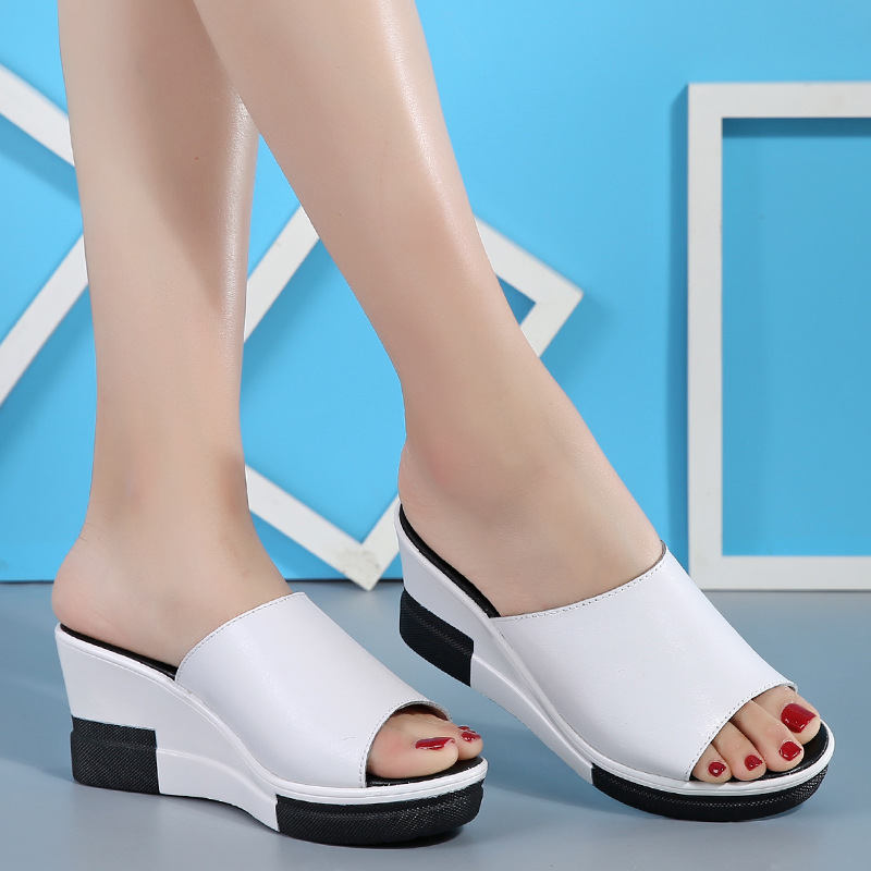 Summer leather soft-soled beach women’s slippers lightweight and comfortable mid-heel wedges non-slip open-toe women’s sandals