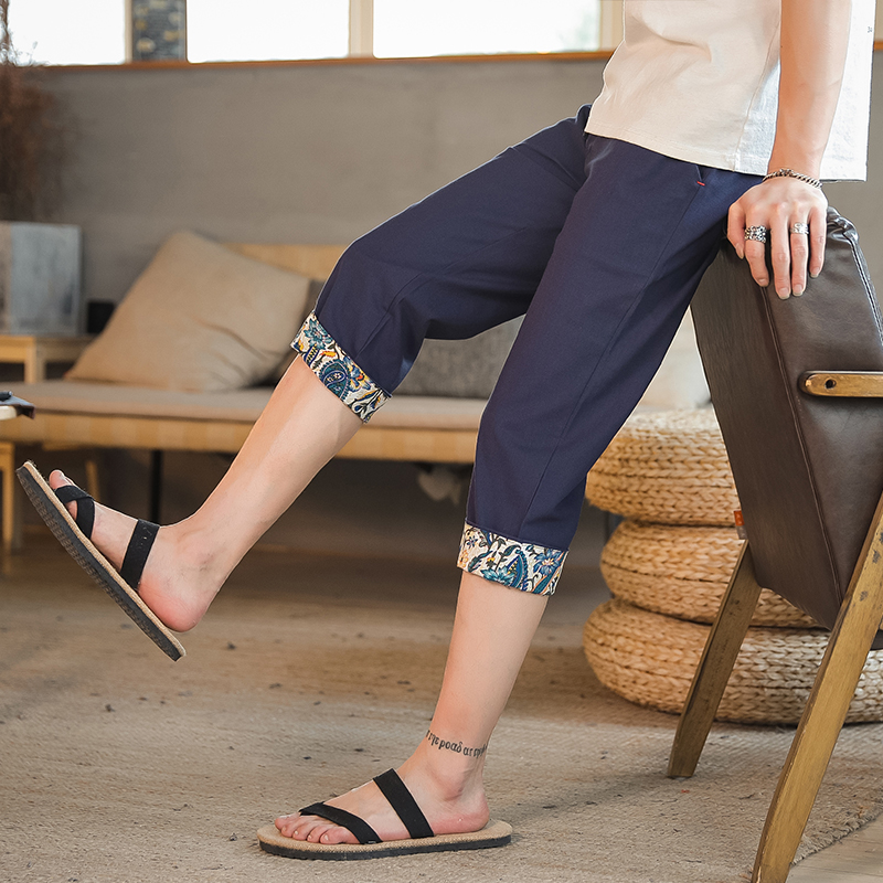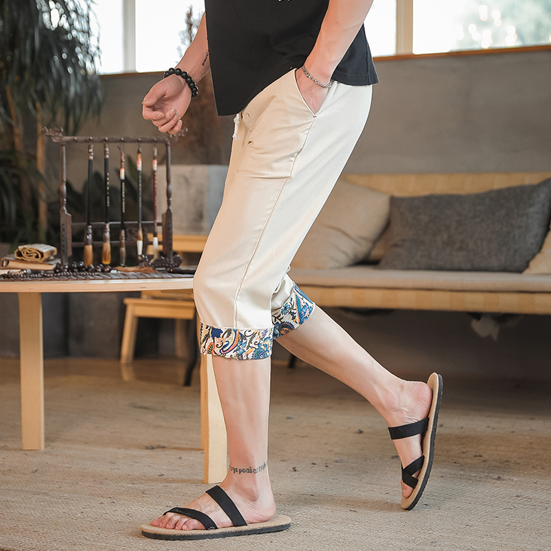 Men Printed Chinese Style Summer Casual Pants Mens Cotton Wide Leg Loose Trousers Male Oversize Calf-Length Pants