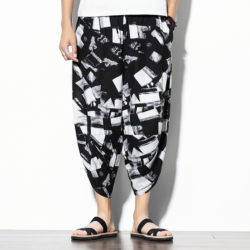 Men Printed Chinese Style Summer Casual Pants Mens Cotton Wide Leg Loose Trousers Male Oversize Calf-Length Pants