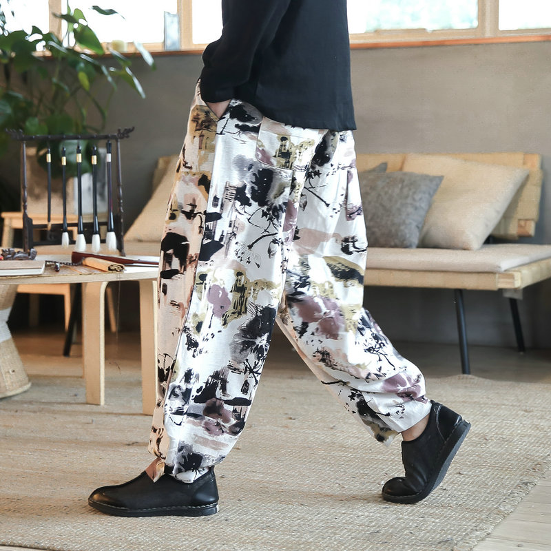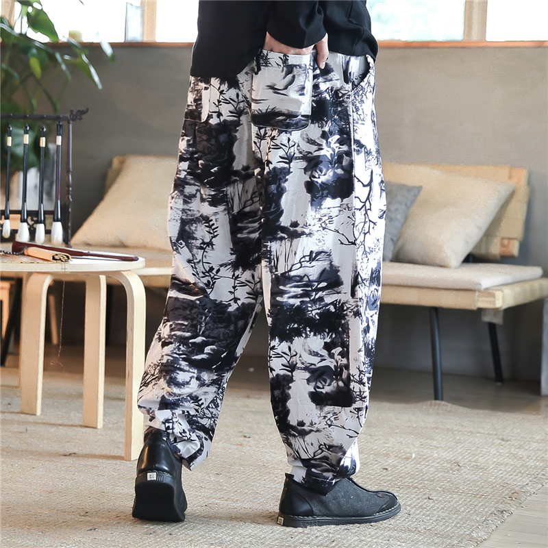Cotton Mens Harem Pants Summer Male Casual Calf-Length Pants Printed Big Pocket Baggy Pants Trousers Men Streetwear