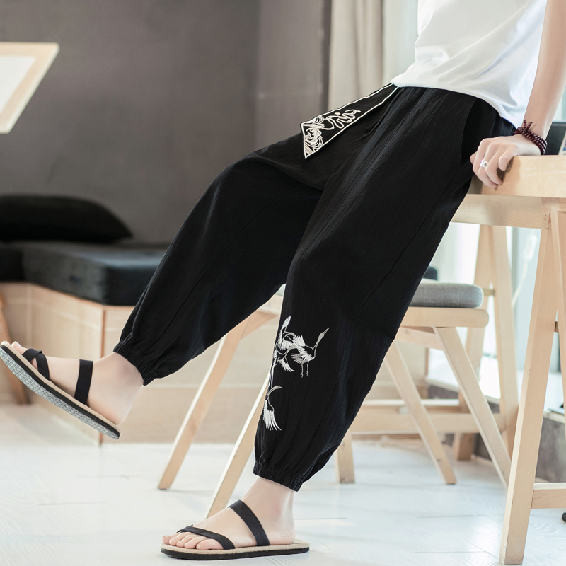 Men Printed Chinese Style Summer Casual Pants Mens Cotton Wide Leg Loose Trousers Male Oversize Calf-Length Pants