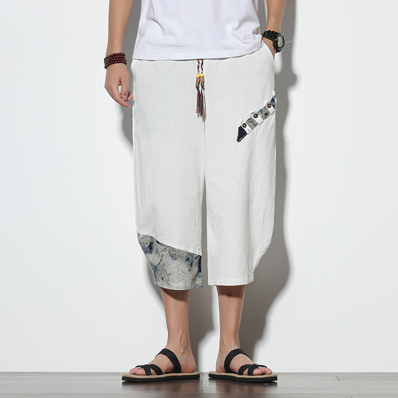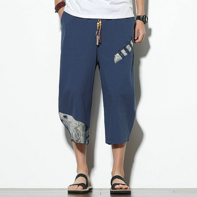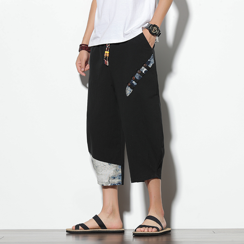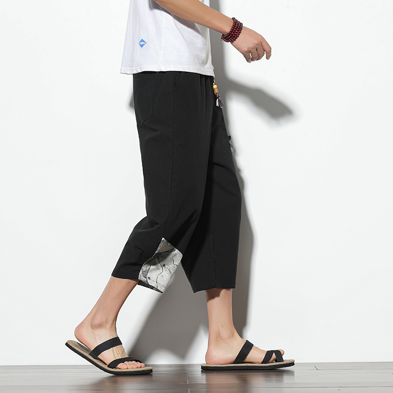 Men Printed Chinese Style Summer Casual Pants Mens Cotton Wide Leg Loose Trousers Male Oversize Calf-Length Pants