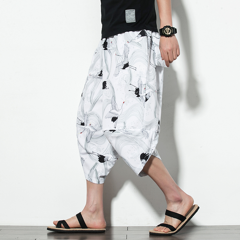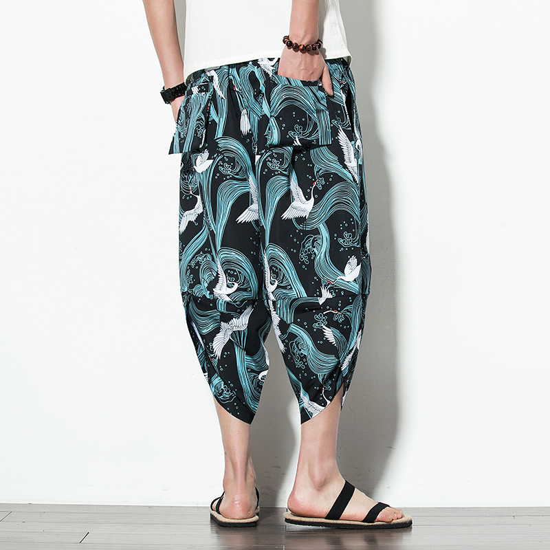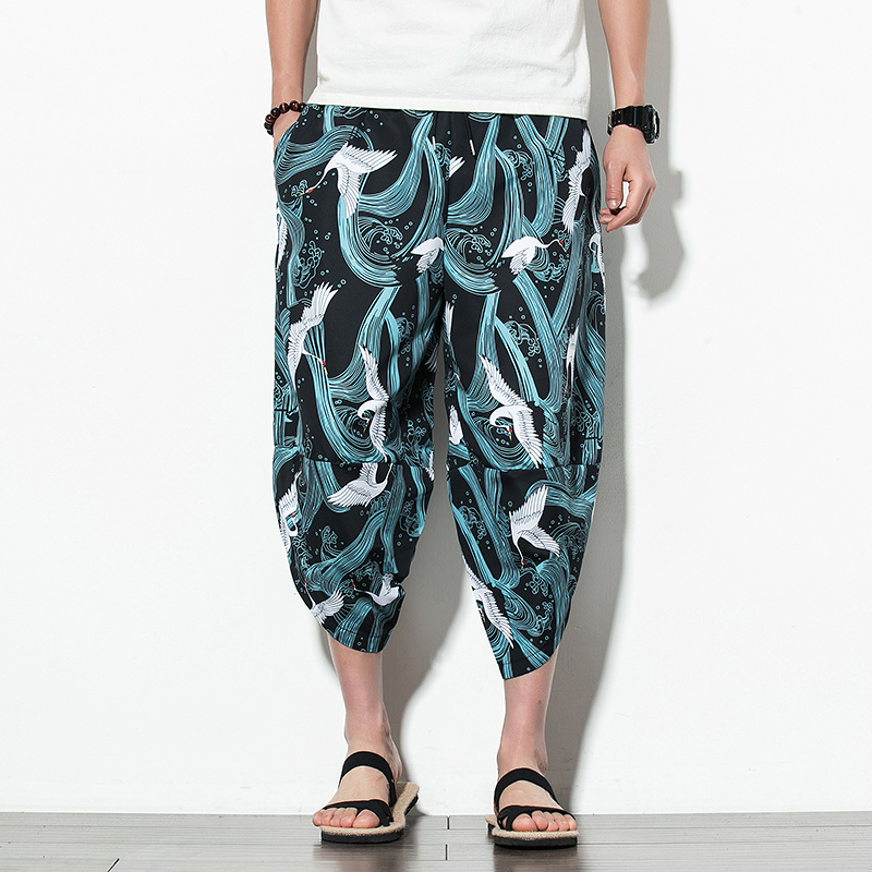 Men Summer Wide Leg Pants Man Casual Calf-length Pants New Printed Cotton Male Baggy Harem Pants Trousers Dropshipping