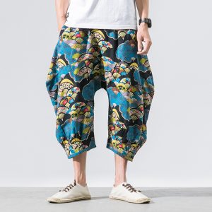 Cotton Mens Harem Pants Summer Male Casual Calf-Length Pants Printed Big Pocket Baggy Pants Trousers Men Streetwear