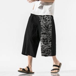 Men Printed Chinese Style Summer Casual Pants Mens Cotton Wide Leg Loose Trousers Male Oversize Calf-Length Pants